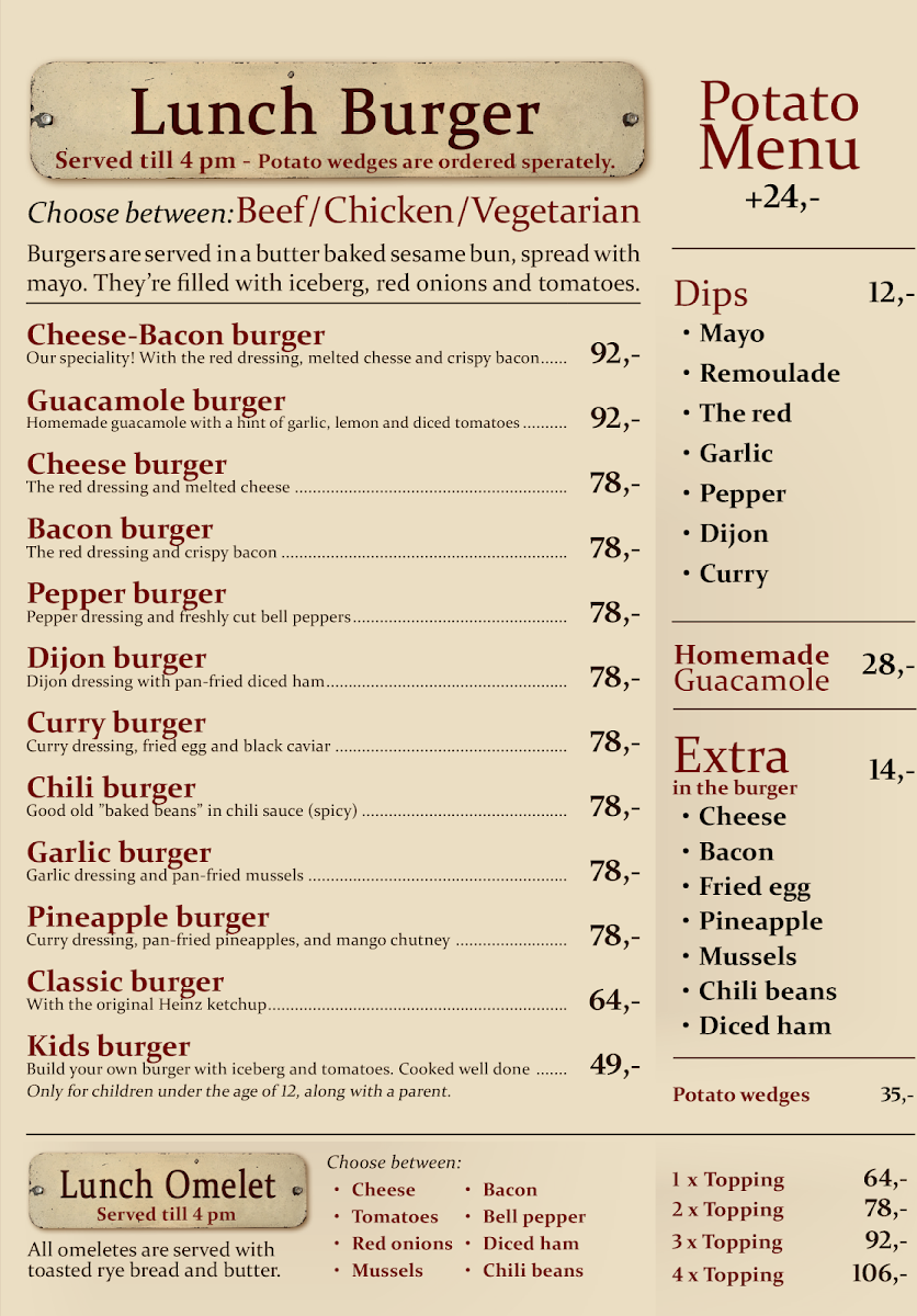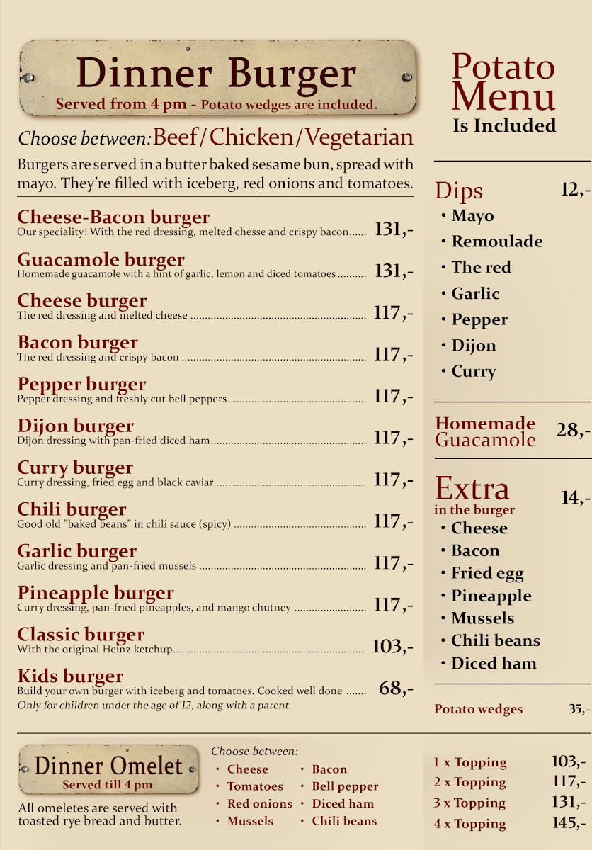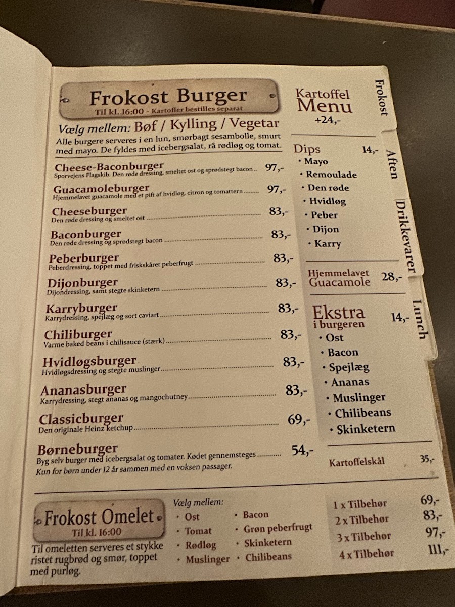 The menu at Sporvejen offers a straightforward and comforting selection focused on quality burgers and casual drinks. It’s a place where simplicity meets thoughtful ingredients, providing satisfying meals that are perfect for a relaxed lunch or an easy evening bite.
